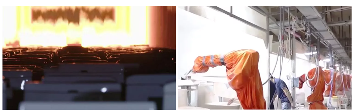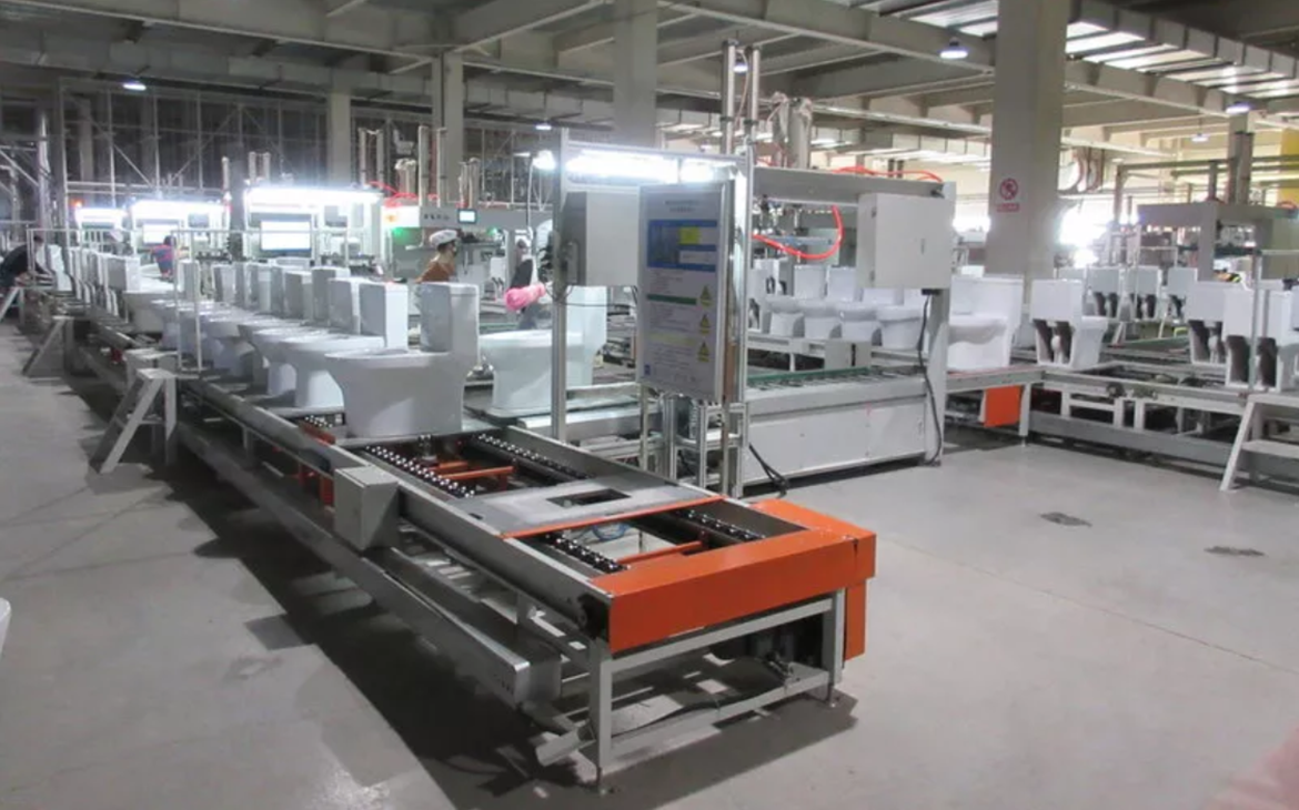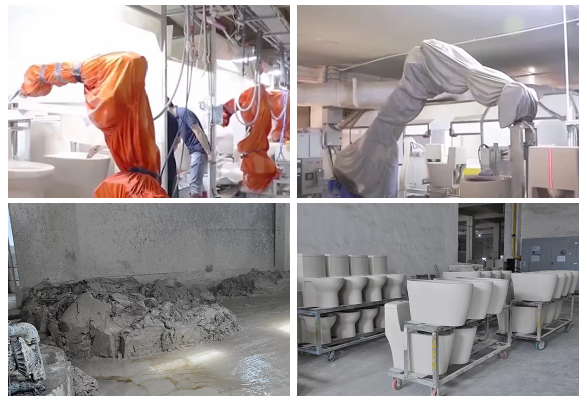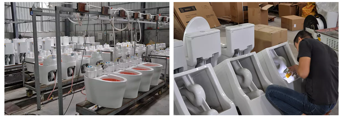 On the automated assembly line, the toilet enters a small work area. Each craftsman carefully wipes it with dust and sponge to make sure it is completely smooth and ready for glazing. The robot glazes the toilet evenly.